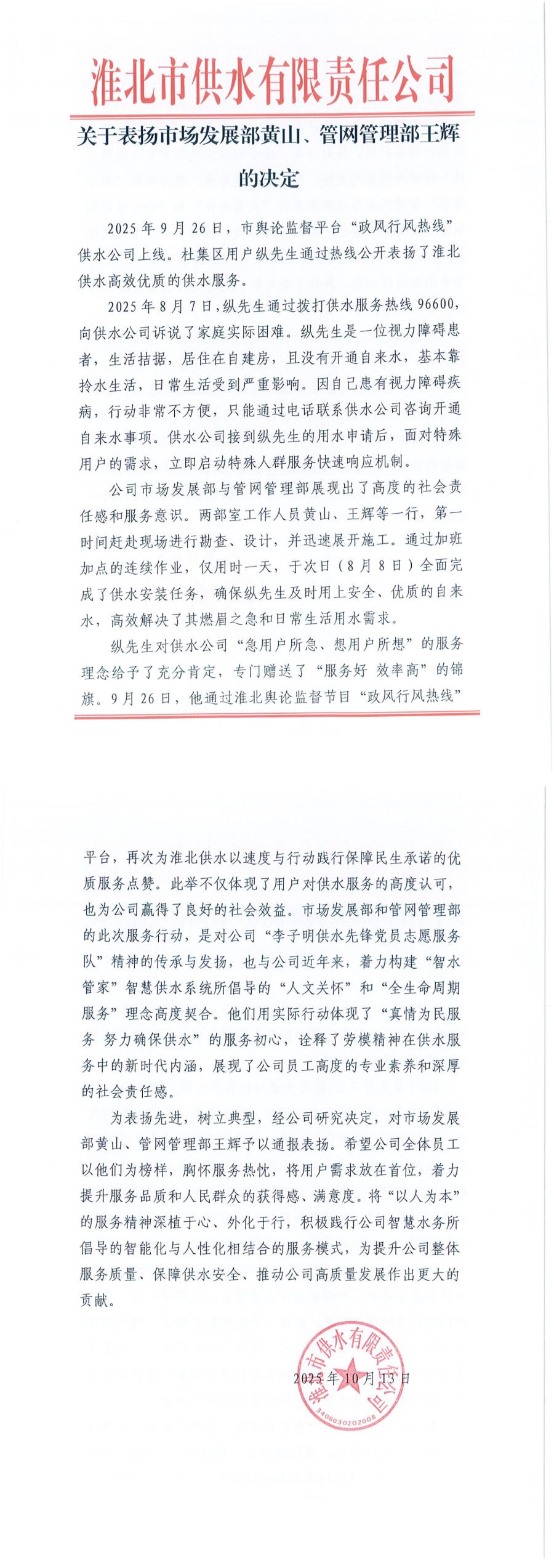 關(guān)于表?yè)P(yáng)市場(chǎng)發(fā)展部黃山、管網(wǎng)管理部王輝的決定